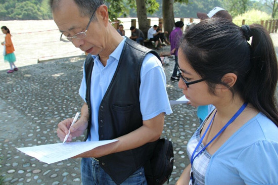 副隊(duì)長呂悅帶領(lǐng)的一隊(duì)隊(duì)員向游客分發(fā)調(diào)查問卷,了解他們對(duì)生態(tài)文明建設(shè)和中國夢(mèng)的看法。