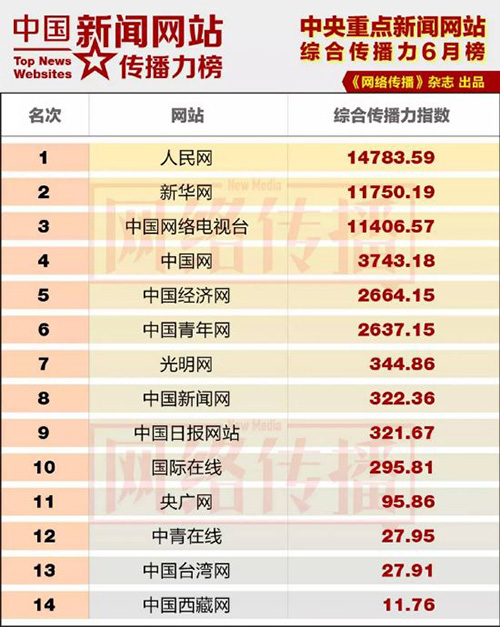中國(guó)新聞網(wǎng)站傳播力榜發(fā)布 人民網(wǎng)位居央網(wǎng)首位