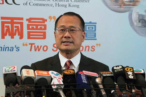 蔡冠深在香港中華總商會(huì)舉辦的“解讀全國(guó)兩會(huì)論壇”上接受采訪