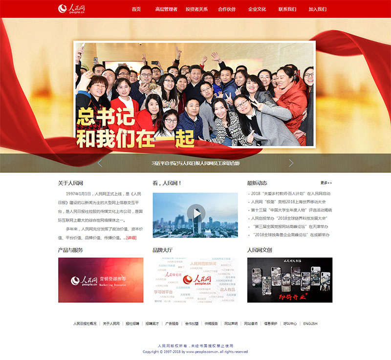 改版后,內(nèi)容呈現(xiàn)上既有人民網(wǎng)實力的全面展示,也突顯了上市公司的專業(yè)化形象。為了便于網(wǎng)友“零距離接觸”人民網(wǎng),頁面主展示區(qū)劃分成“關(guān)于人民網(wǎng)”“看,人民網(wǎng)!”“最新動態(tài)”“產(chǎn)品與服務(wù)”“品牌大廳”“人民網(wǎng)文創(chuàng)”六大塊區(qū)域,內(nèi)容重點突出,直觀醒目。