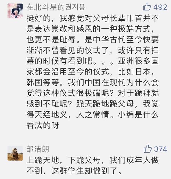 有網(wǎng)友表達支持:“生活需要儀式感,跪天跪地跪父母有啥可質(zhì)疑?”