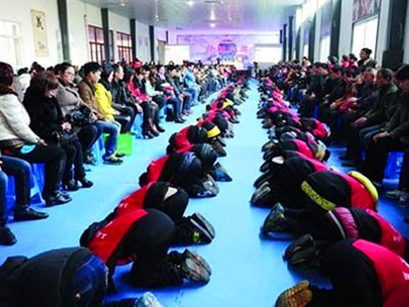 上海某民辦學校舉辦“孝敬文化節(jié)”“校園集體跪拜孝敬父母”場景(圖片源自網(wǎng)絡(luò))