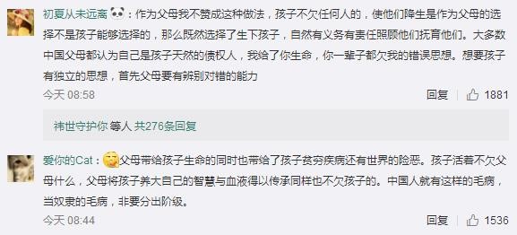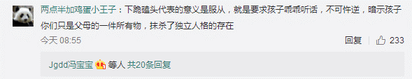網(wǎng)友“兩點半加雞蛋小王子”:下跪磕頭代表的意義是服從,就是要求孩子乖乖聽話,不可忤逆,暗示孩子你們只是父母的一件所有物,抹殺了獨立人格的存在。