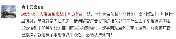 引發(fā)爭(zhēng)議的廣告是“凱迪仕智能鎖”雙11期間推出的。網(wǎng)友認(rèn)為該廣告涉嫌侮辱排雷戰(zhàn)士,紛紛聲討:利欲熏心,無底線,無下限,要是不肅清,對(duì)不起那么多流血犧牲的英雄!