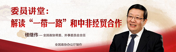 全國(guó)政協(xié)辦公廳制作的“委員講堂”第二期節(jié)目,3月2日在全國(guó)政協(xié)官方網(wǎng)站等平臺(tái)播出。本期節(jié)目由全國(guó)政協(xié)常委、外事委員會(huì)主任樓繼偉主講,主題是《共建與共享——關(guān)于“一帶一路”和中非經(jīng)貿(mào)合作的思考》。