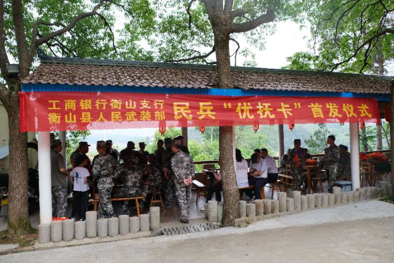 前不久,衡山縣人武部與中國工商銀行衡山支行舉行民兵“優(yōu)撫卡”首發(fā)儀式,給正在參加防汛演練的30余名基干民兵送去了一份特別的小禮物——“隨軍行擁軍優(yōu)撫卡”。 這張卡,是今年年初該縣人武部主動與銀行進行溝通協(xié)調(diào)后,專門設(shè)計制作的一張融身份識別功能與金融服務(wù)功能于一體的民兵優(yōu)撫卡。卡的正面背景圖案是一位身著軍裝的民兵照片,并印有“隨軍行擁軍優(yōu)撫卡”字樣。
